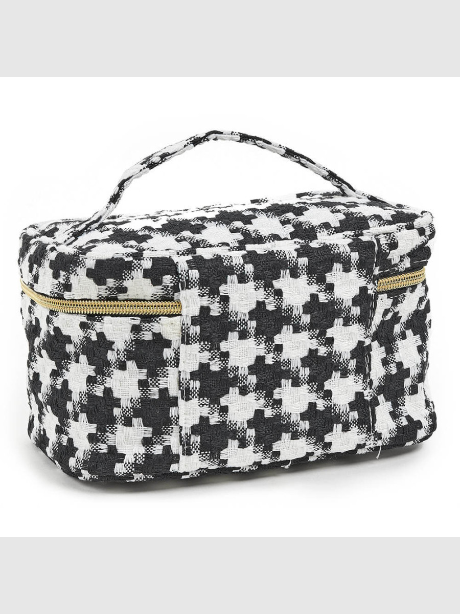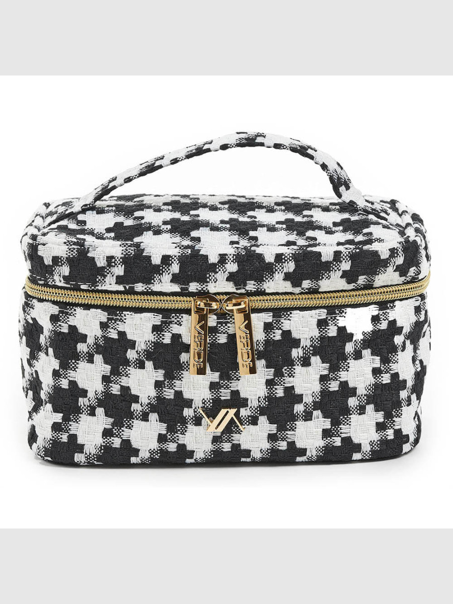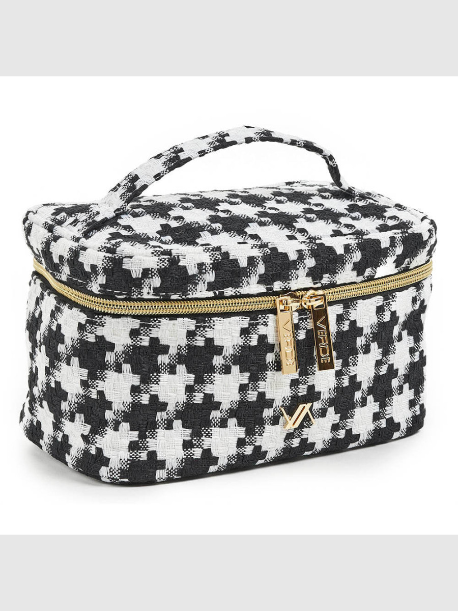 Beauty case da viaggio con tessuto Tweed, apertura principale con due cerniere, fornendo un ambiente organizzato per i tuoi prodotti di bellezza essenziali. Dimensioni: 22 x 14 x 13 cm . Linea Verde.