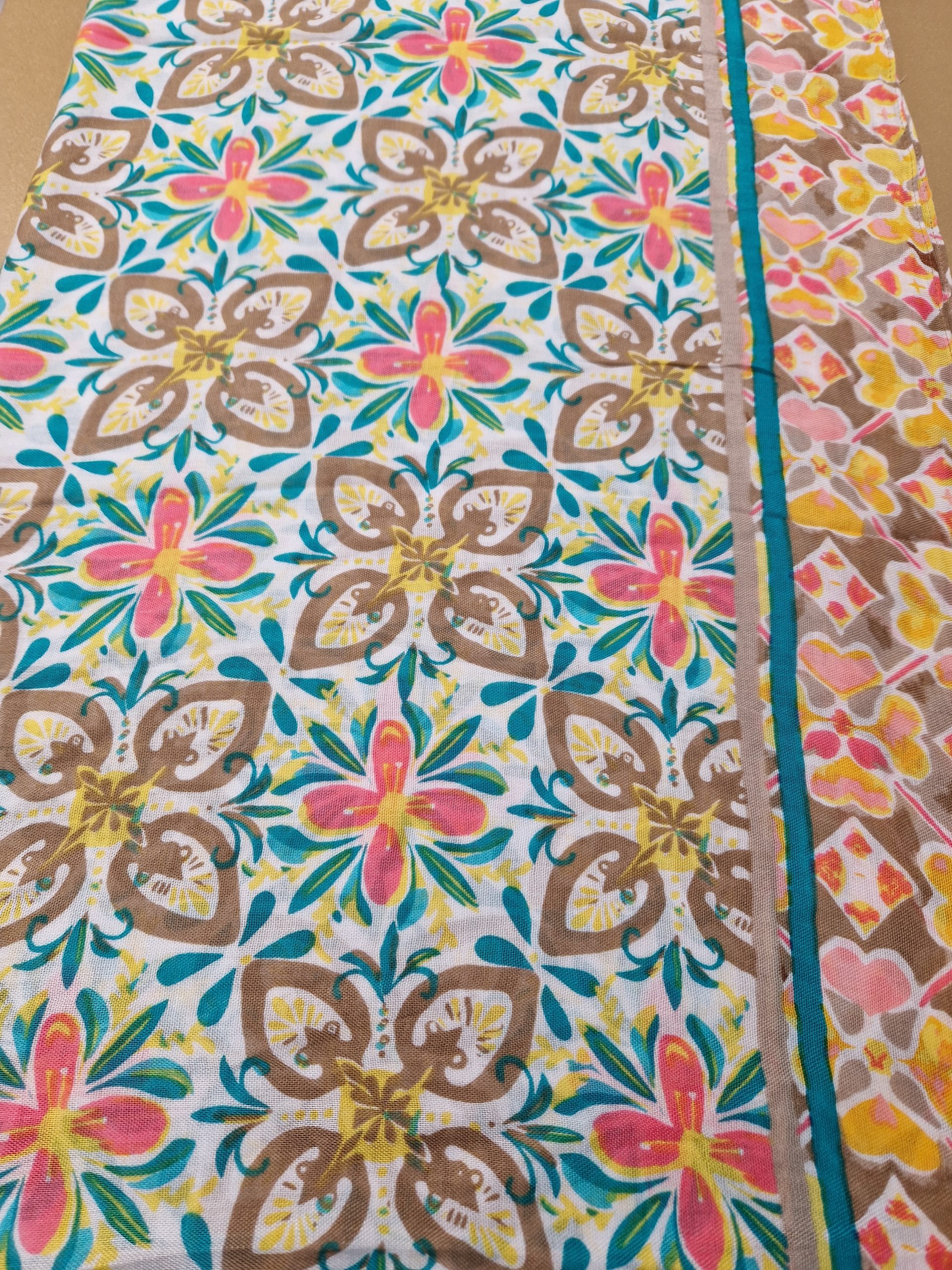 Pareo in poliestere con fantasia colorata astratta. Dimensioni 180×90 cm. Linea Verde.